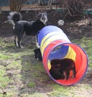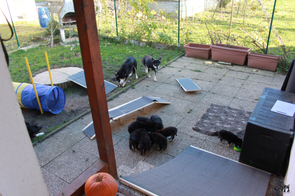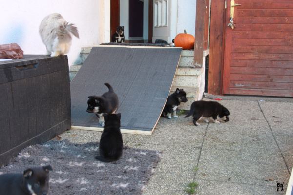 Ab der vierten Woche steht es den Welpen frei, den Garten jederzeit aufzusuchen Dieser wurde an die Welpen adaptiert und ein kleiner Welpenspielgarten mit Bällebad, Durchgang mit Flaschen und Dosen, Tunnel etc. eingerichtet, welcher von den Welpen ungezwungen erkundet werden kann.