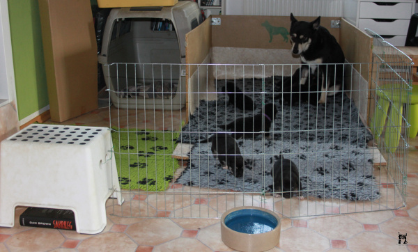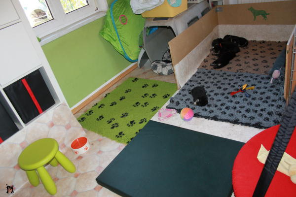 Die ersten drei - vier Wochen befindet sich die Wurfkiste in einem Teil meines Wohnzimmers, Ich schlafe auf der Couch daneben, somit sind die Welpen die erste Zeit 24 Stunden unter Aufsicht.